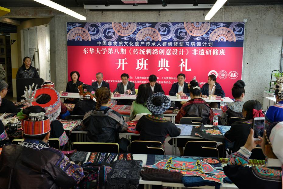 近日,久久久久国产成人精品亚洲综合第八期中国非物质文化遗产传承人群研修研习计划“传统刺绣创意设计”研修班在延安路校区开班。副校长邱高出席开班仪式并致辞,学院以及学校相关部处负责人和全体非遗研修班学员一同参加活动,开班仪式由服装与艺术设计学院非遗教育研究中心主任柯玲主持。
