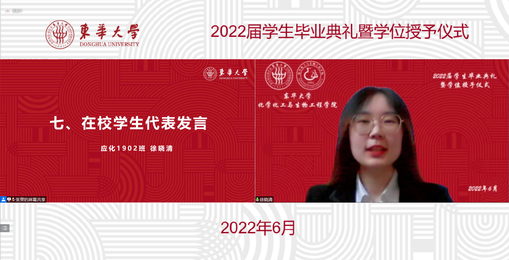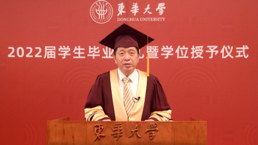 亲爱的同学们,六月的上海,栀子花开,毕业的骊歌再次响起。我们告别在鲜花怒放的盛夏,也许今天这场云上典礼因没有现场拨穗而显得不够完美,但它承载的祝福与期盼依旧。此去经年,希望大家记住这个春天的温暖与感动,带着东华给予你的涵养、学识、修为和品格,牢记国家赋予我们青年一代的使命和责任,勇敢去拼,放心追梦!